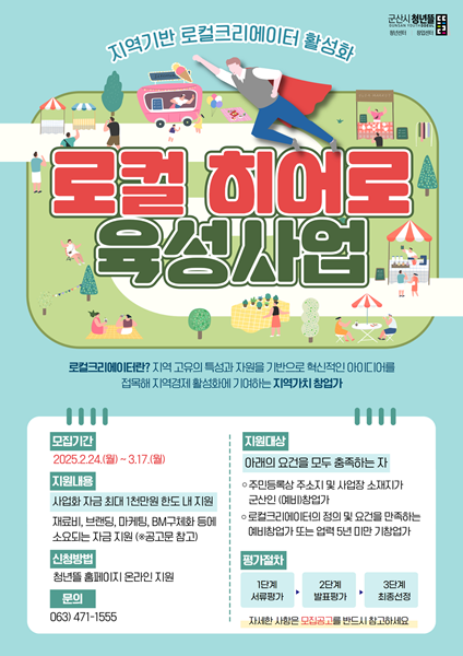 군산시 청년뜰 창업센터(이하 창업센터)가 ‘2025 로컬 히어로 육성사업’ 참여자를 모집한다.