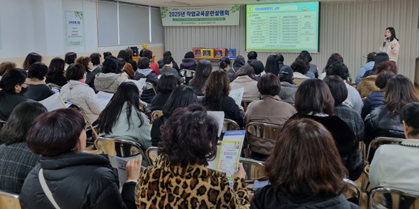 직업교육훈련 설명회에서는 올해 운영되는 국비훈련으로 여성가족부 지원 총 7개 과정(AI 콘텐츠디자인전문가, 실버인지케어전문가, K-디저트 전문가, 정리수납가사관리전문가, 한식조리기능사 양성, 사회복지행정실무자, 간호조무사현장실무자 양성)에 대한 정보를 제공하고 사전접수를 진행했다.