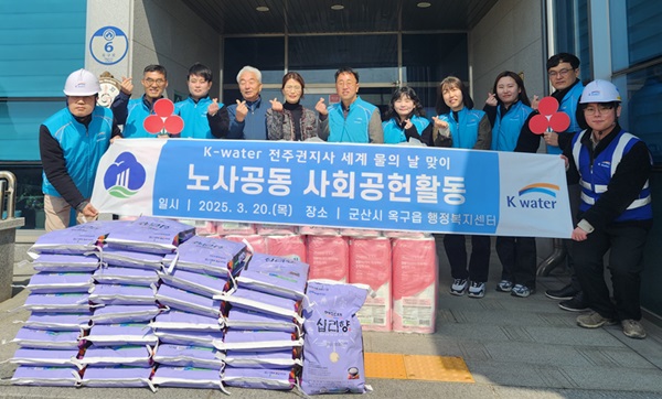 K-water 전주권지사에서 노사 공동(지사장 신창식‧노동조합 지부장 박승혁)으로 쌀(10kg) 30포와 롤 화장지 30세트(2백만원 상당)의 생필품을 군산 옥구읍에 전달했다.