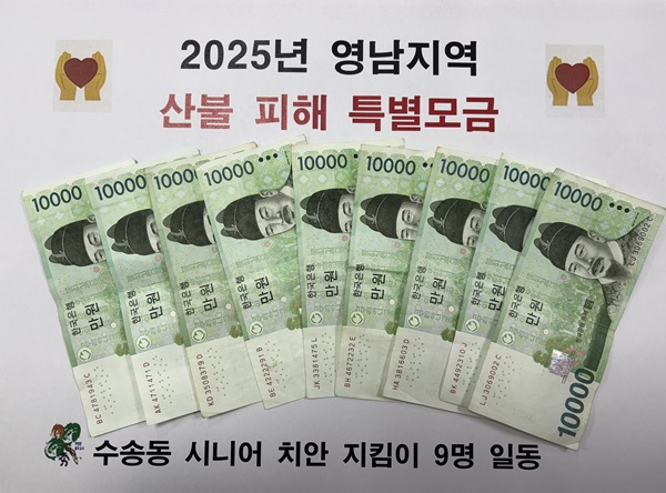 수송동행정복지센터는 지난달 31일 수송동 시니어 치안지킴이 노인일자리 어르신 9명이 영남지역 대형산불 피해 주민들을 위해 성금 9만원을 기탁했다고 밝혔다.