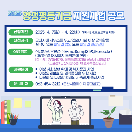 군산시는 양성평등 문화 확산을 위한 ‘2025년 양성평등기금 지원사업’참여 단체를 공모한다.