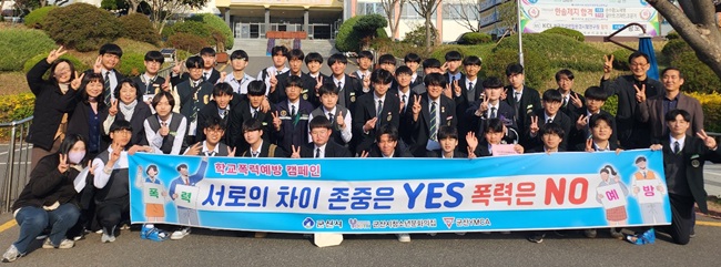군산기계공고 학교 내에서 청소년들이 주도적으로 건강한 학교 분위기와 환경을 조성하기 위해 학교폭력을 예방하자는 의지를 보여준 캠페인으로 군산기계공고 김홍남 교감, 이승래 담당교사, 김미옥 액션러닝협동조합 이사장을 비롯해 군산기계공고 4H동아리 등 270여명의 청소년이 참여했다.