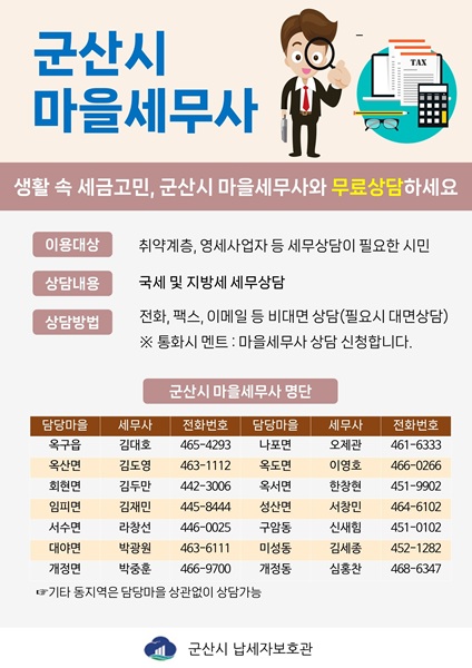 상담을 희망하는 주민은 군산시 누리집, 군산시 지방세 관련 창구 등에 비치된 홍보자료를 통해 ‘마을세무사’ 연락처 확인 후 전화·팩스·이메일을 통해 신청하면 된다.