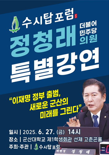 수시탑포럼이 주관하는 이번 초청특강은 ‘이재명정부 출범, 새로운 군산의 미래를 그린다’는 주제로 군산에 대한 발전과 정청래의원이 생각하는 미래비전 등을 시민들과 함께 공감하며 제시할 계획이다.