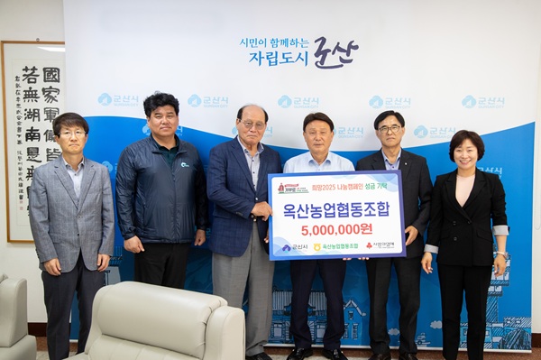 군산 옥산농업협동조합(조합장 박규석)이 26일 지역사회 소외층을 위해 써달라며 성금 500만원을 군산시에 전달했다.