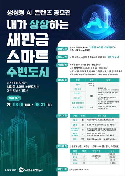새만금개발공사(사장 나경균, 이하 공사)는 시민의 상상력과 창의력을 바탕으로 새만금 스마트수변도시의 미래를 시각화하는 ‘AI로 그리는 새만금 스마트 수변도시’ 이미지 공모전을 이달 31일까지 진행한다고 밝혔다.