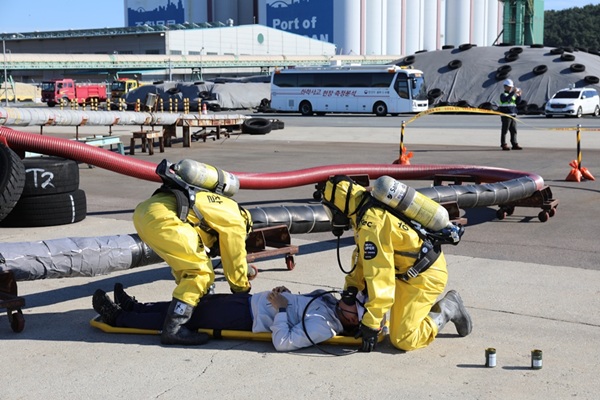 이번 훈련은 곡물을 가득 실은 2천t급 선박의 화물적재 구역에서 화재 연기가 발생하자 당황한 선원이 불을 끄기 위해 물을 뿌려 ‘훈증제’ 화재ㆍ폭발로 이어지는 상황을 가정했다.