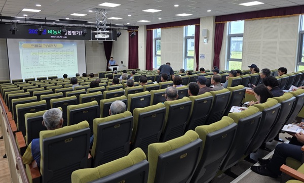 군산시농업기술센터(소장 황관선)는 지난 25일 3개 벼농사 시범사업 단지·쌀 채종포단지·선도농업인·농업인상담소장 등 80여 명이 참석한 가운데 ‘2025년 벼농사 종합 평가회’를 농업인평생학습센터 강당에서 개최했다.