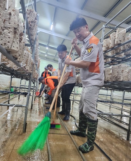 대원들은 흙탕물이 빠져나간 버섯 건조동 바닥에 말라붙은 진흙을 일일이 쓸어 내며 소중한 구슬땀을 흘렸다.