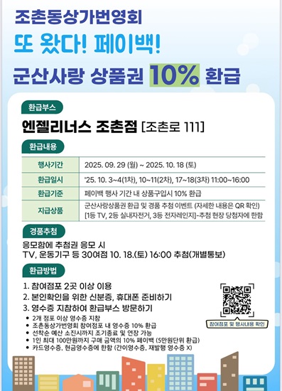 조촌동 상가번영회(회장 한일만)가 조촌동 지역 상권 홍보 및 활성화와 주민 부담 경감을 위해 29일부터 오는 10월 18일까지 ‘추석 명절 맞이 조촌동 상가번영회 페이백 행사’를 진행한다.