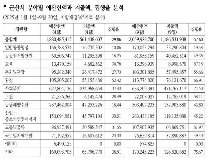 군산시 예산 집행률이 9월 말 기준 57.6%로 절반을 웃도는 수준으로 집계됐다.