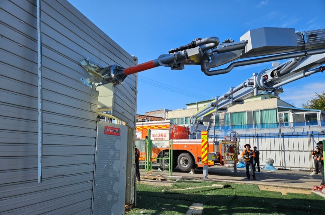 훈련에 투입된 무인파괴방수차는 원격 조종으로 최대 21미터 높이까지 노즐을 전개해 4mm 철판과 160mm 두께 콘크리트 벽을 관통할 수 있는 고성능 장비로 소방대원이 직접 접근하기 어려운 고열‧폭발 위험 현장에서도 외벽이나 천장을 뚫고 내부에 소화용수를 직접 분사할 수 있다.