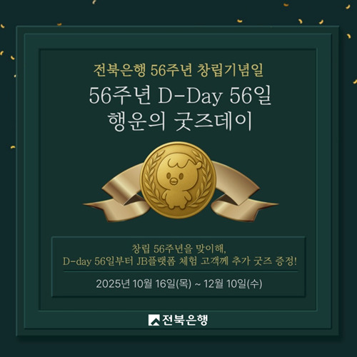 JB금융그룹 전북은행(은행장 백종일)은 창립 56주년을 기념해 오는 12월 10일까지 ‘56주년 D-Day 56일 행운의 굿즈 데이’ 이벤트를 진행한다.