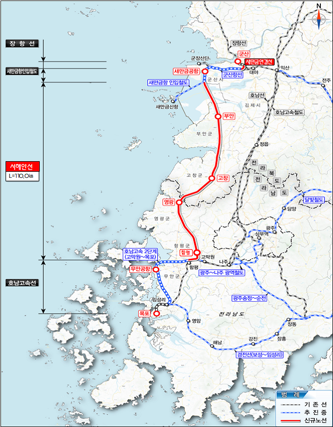 이 사업은 부산~강릉 동해선처럼 군산에서 목포까지 서해안을 따라 고속철도를 새로 건설하는 사업으로 기존 150km의 새마을호를 거쳐 250km 정도 준고속철도에서 시속 300km로 KTX가 운행된다.