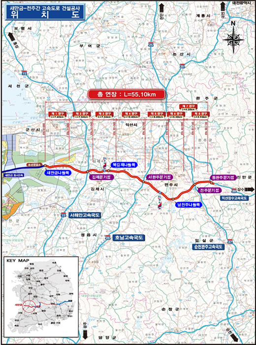 전북도에 따르면 새만금~전주 고속도로는 새만금(김제 진봉)에서 완주 상관까지 연결되는 55.1㎞ 구간으로 서해안 관문 새만금과 전북 중심 전주 간 이동시간이 기존 76분에서 33분으로 절반 가량 단축된다.
