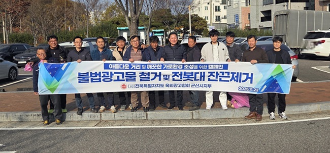 (사)전북자치도 옥외광고협회 군산시지부(지부장 김종호)는 지난 22일 쾌적하고 안전한 보행환경 조성과 도시 미관 개선을 위해 불법 옥외광고물 정비활동을 펼쳤다.