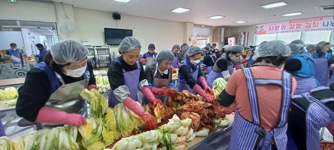 행사는 오전 야채 손질과 재료 준비로 시작해 김치 버무리기와 포장, 읍면동 배부까지 이어졌으며 참여자들은 이웃을 향한 따뜻한 마음으로 준비된 배추 2,000kg(200상자)의 김장을 정성껏 담갔다.
