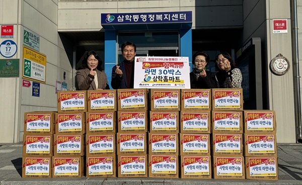 삼학홈마트(대표 양은영)가 관내 취약층 돕기에 써달라며 라면 30상자를 기부하는 따뜻한 나눔을 실천했다.