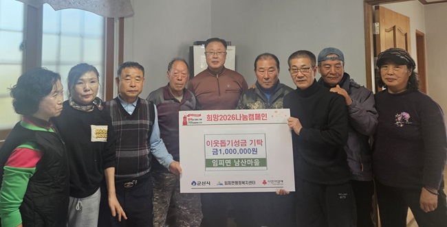 임피면 남산마을(이장 이정구) 주민들이 어려운 이웃을 위해 십시일반 ‘사랑의 성금’ 100만원을 기탁하며 지역사회에 따뜻함을 전했다.