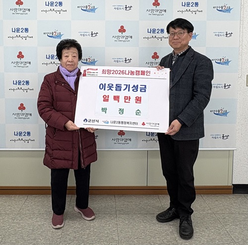 남귀우 나운2동장은 “매년 어려운 주민들을 위해 성금을 기탁하신 어르신의 마음에 감동받았다”며 “이 성금을 통해 이웃사랑의 마음을 잘 전달하도록 더욱 노력하겠다”고 전했다.
