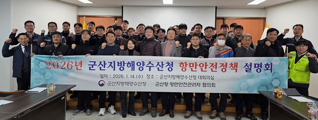 군산해수청은 항만하역 근로자, 단체, 기업체와 합동으로 14일 군산청 대회의실에서 ‘2026 항만안전정책 설명회’를 개최했다.