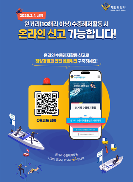 군산해양경찰서는 해안선으로부터 10해리(약 18.5km) 이상 떨어진 원거리에서 이뤄지는 스킨스쿠버, 프리다이빙 등 수중레저 활동의 신고 절차를 획기적으로 개선했다.