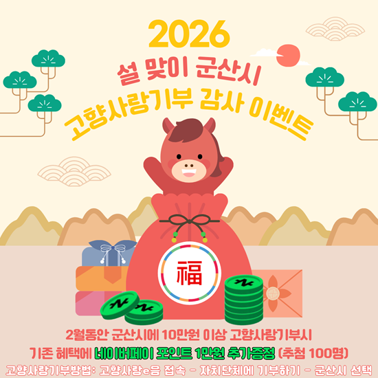 군산시가 민족 대명절인 설을 맞아 고향사랑기부제 활성화와 기부 문화 확산을 위해 2월 한 달간 ‘설맞이 고향사랑기부제 특별 이벤트’를 진행한다.