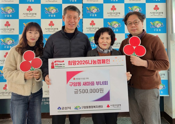 구암동 새마을부녀회(회장 김봉임)는 23일 구암동행정복지센터에 어려운 이웃을 위한 성금 50만원을 기탁하며 따뜻한 나눔을 실천했다.