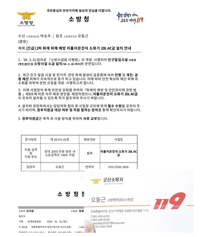 위조 공문 내세워 리튬이온전지 소화기 구매 유도