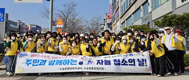 참여자들은 수송동 주요 도로변과 인도, 공원 주변에 버려진 생활 쓰레기를 수거하고 전신주 등에 부착된 불법광고물 제거와 가로화단 정비 등 세심한 환경정화 활동에 구슬땀을 흘렸다.