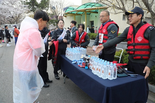 또한, 마라톤 참가자와 거리에 응원하러 나온 시민들의 갈증 해소를 위해 ‘구명조끼 착용 생활화’ 문구 스티커를 부착한 생수를 배부하며 큰 호응을 얻었다.