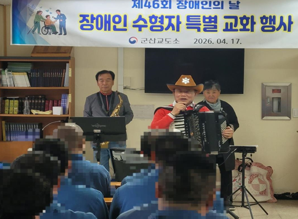 군산교도소(소장 조항덕)는 지난 17일 ‘장애인의 날’(제46회 장애인의 날, 4. 20.)을 기념해 군산시민예술단 박문원 단장 등 7명을 초청해 장애인 수형자들을 위한 음악 재능기부 공연을 개최했다고 밝혔다.