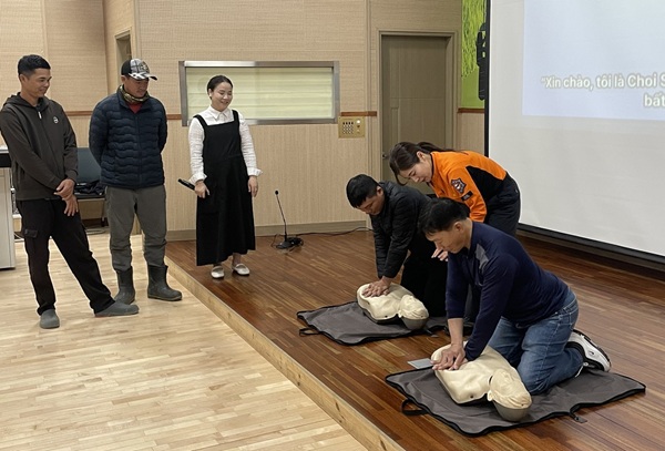 이론교육에 이어 실습용 소화기와 마네킹을 활용한 체험형 교육도 진행됐으며 참여자들은 직접 소화기를 사용해 화재 진압 요령을 익히고 심폐소생술을 실습하며 위기 대응능력을 강화했다.