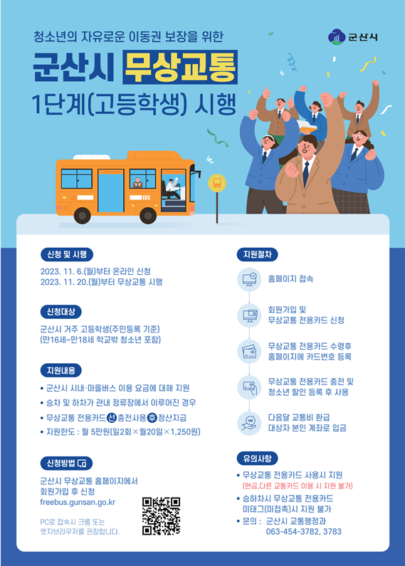 민선 8기 강임준 시장의 공약사업인 ‘중·고등학생 시내버스 무상교통 사업’이 오는 20일부터 시행된다. 이를 통해 시내버스를 이용하는 중․고등학생의 부담을 덜고, 교통복지와 이동권 증진을 도모할 것으로 기대된다.