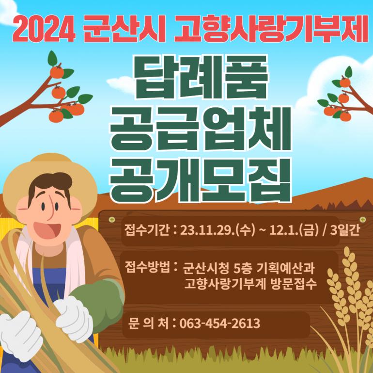 군산시가 2024년 고향사랑기부제 답례품 공급업체를 오는 12월 1일까지 공개모집 한다.