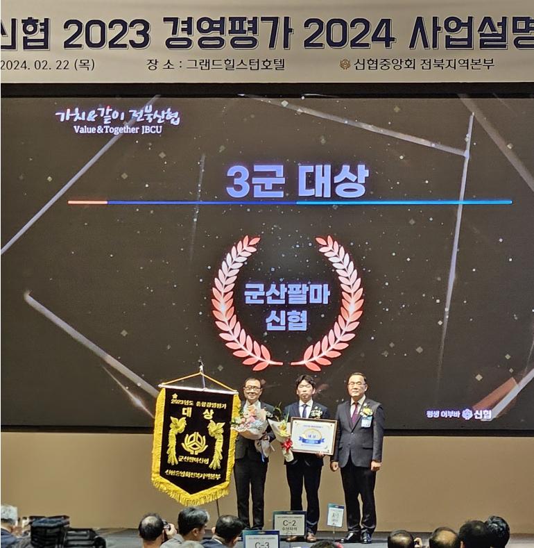 군산팔마신협은 지난 22일 전주 그랜드힐스턴 호텔에서 개최된 ‘2023 경영평가 및 2024 사업설명회’에서 전북 70개 신협을 대상으로 하는 전북신협 2023년도 조합경영평가에서 대상을 수상했다고 전했다.