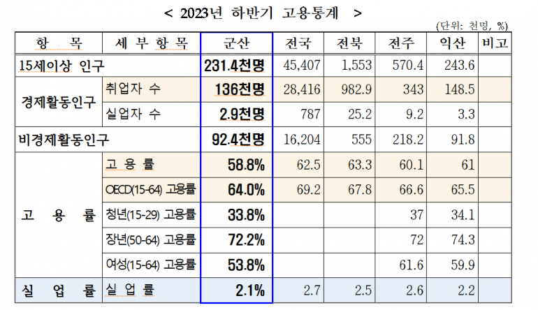 시에 따르면, 지난 20일 통계청이 발표한 ‘2023년 하반기 지역별 고용조사’ 결과, 군산은 2023년 58.8%의 고용률을 기록했다. 이는 지난해 동기 대비 2.2%p 증가한 수치이며, 취업자 수는 지난해 동기와 비교해 4,800명이 증가한 13만6,000명을 기록했다.