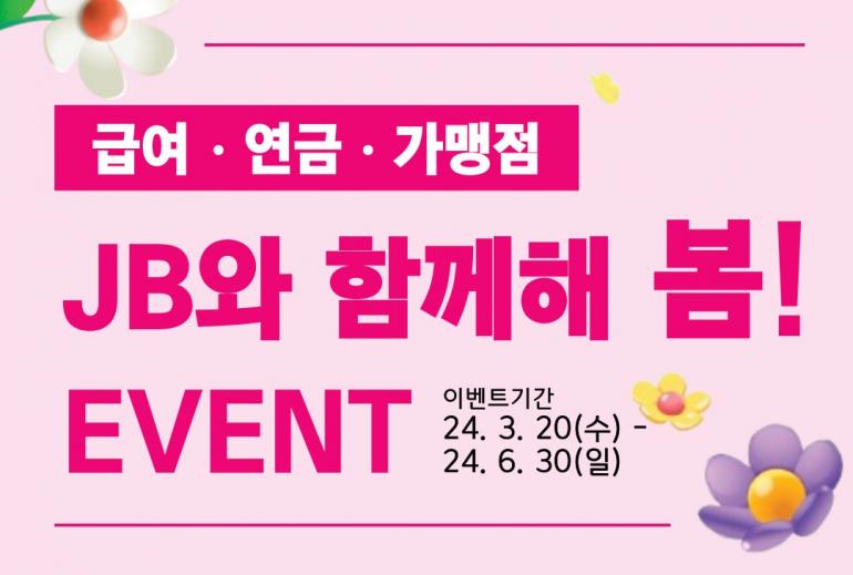JB금융그룹 전북은행(은행장 백종일)이 20일부터 오는 6월 30일까지 급여‧연금‧가맹점 대금을 전북은행 계좌로 입금받는 고객을 대상으로 ‘JB와 함께해 봄’ 이벤트를 실시한다.