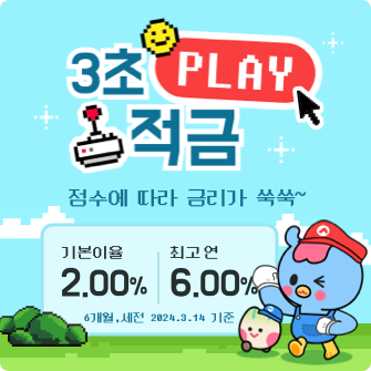 지난 14일에 출시한 ‘3초 플레이적금’은 3초를 정확하게 맞추는 단순한 게임을 적금상품에 접목해 플레이 점수 및 참여횟수에 따라 우대금리를 받는 상품으로, 가입기간은 6개월, 가입금액은 월 1만원 이상 50만원 이하로 가입 가능하며, 가입월로부터 5개월간 월 20회씩 모두 100회의 게임에 참여할 수 있다.