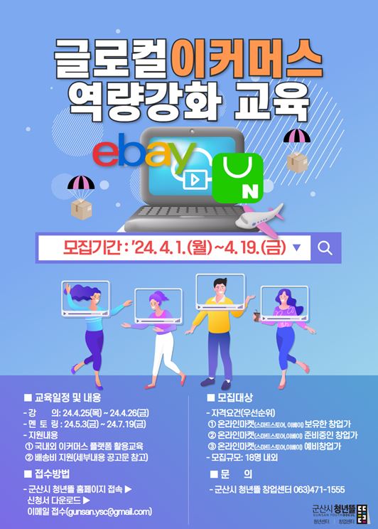 군산시 청년뜰(센터장 오원환)은 이달 1일부터 19일까지 관내 예비 창업가·창업가들을 위한 ‘글로컬 이커머스 역량강화 지원사업’ 참여자를 모집한다.