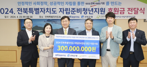 전북은행은 23일 자립 준비 청년 지원사업 후원금으로 지난해보다 1억원 증액한 3억원을 전북자치도에 기탁했다.