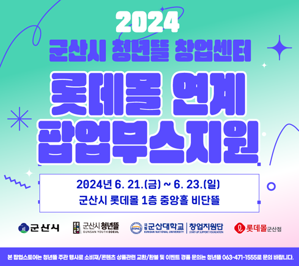 군산시 청년뜰 창업센터(이하 창업센터)가 13일부터 오는 24일까지 지역 창업가의 매출 증가와 판로개척을 위해 ‘2024년 롯데몰 연계 팝업부스 지원사업(이하 팝업부스 지원사업)’ 참여자를 모집한다.