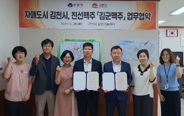 군산시농업기술센터(소장 채왕균)과 김천시농업기술센터(소장 정한열)은 지난 28일 군산시농업기술센터에서 김천과 군산의 농산물을 반반 섞어 만든 친선 수제 맥주 생산을 위한 업무 협약을 체결했다.