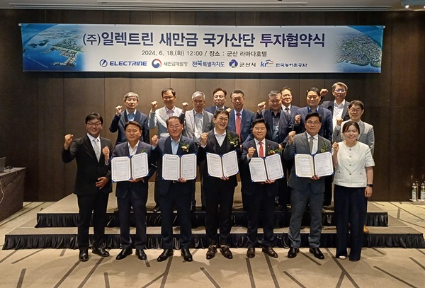이날 협약식에는 원준희 ㈜일렉트린 대표를 비롯 김경안 새만금개발청장, 김종훈 전북자치도 경제부지사, 강임준 시장, 안재호 한국농어촌공사 단장 등이 참석한 가운데 진행됐다.