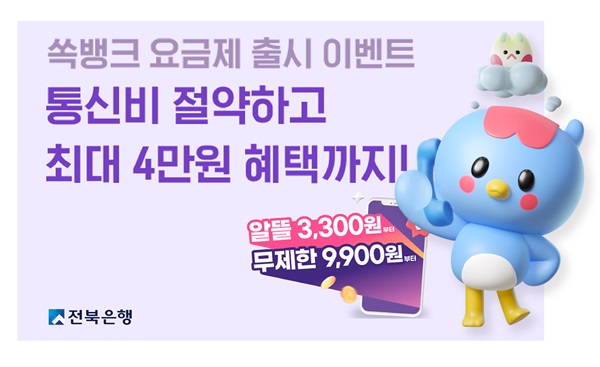 이번 알뜰폰 요금제 출시를 기념한 이벤트도 진행한다. 전북은행은 ‘쏙뱅크 요금제’를 가입한 전북은행 최초 신규고객 총 1000명에게 1만원 캐시백을 제공하며 프리티는 선착순으로 ‘쏙뱅크 알뜰폰 요금제’ 가입 고객에게 1만원 상품권을 제공한다.