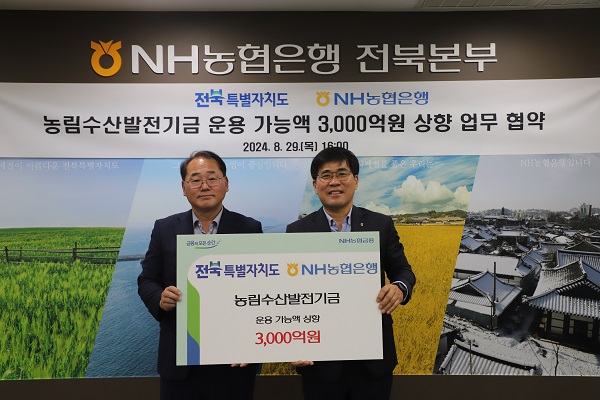 전북특별자치도와 NH전북농협은행은 29일 농림수산발전기금 융자대출 한도를 기존 2,000억원에서 3,000억원으로 상향하는 업무협약을 체결했다.
