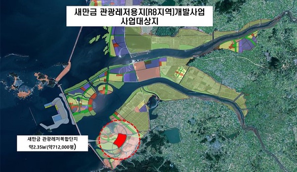 새만금개발청(청장 김경안)은 2,500억원 이상을 직접 투자해 관광레저용지 공유수면 2.35㎢(새만금기본계획 상 R8지역) 내에 관광레저복합단지를 개발할 사업자를 이달 3일부터 공모한다고 밝혔다.