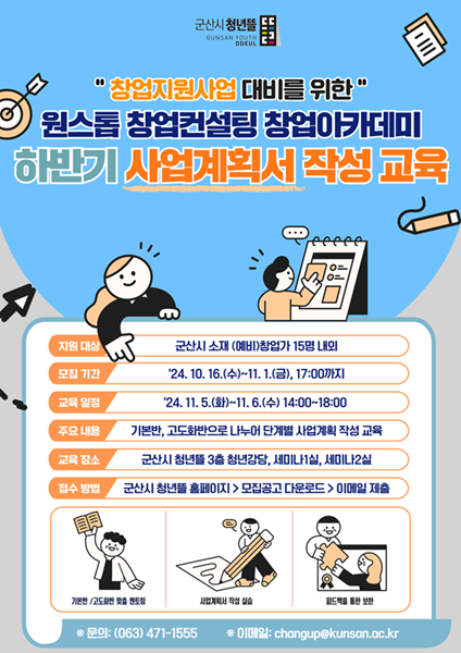 군산시 관계자는 “이번 교육을 통해 (예비)창업가들이 창업아이템을 구체화하고 직접 사업계획서를 작성해보며 정부지원사업에 대비하고 비즈니스 기회를 확대하는 계기가 되길 바란다”라고 전했다.