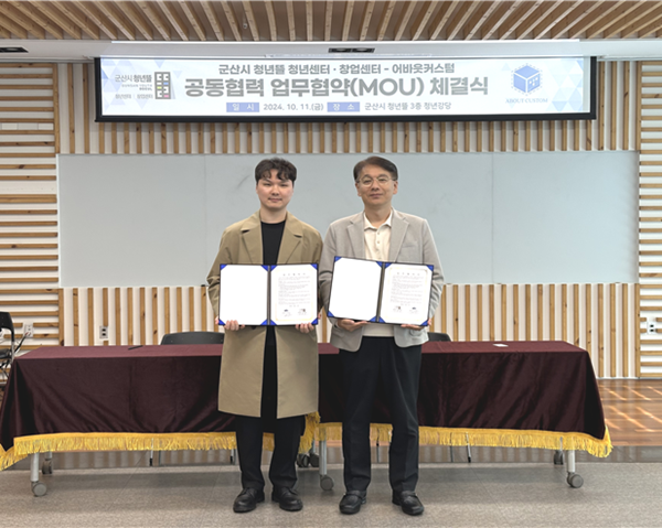 군산시 청년뜰 청년센터·창업센터(센터장 오원환)와 궂즈 제작과 콘텐츠 제작 전문회사인 어바웃커스텀(대표 전재성이 지역 청년과 창업가를 지원해 창업생태계 활성화를 위해 손을 맞잡았다.