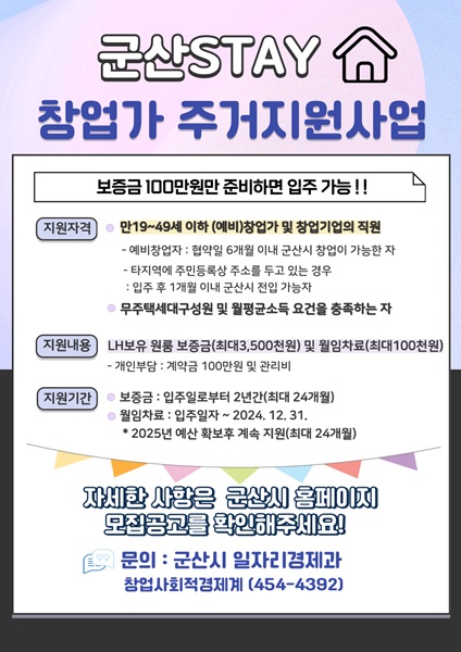 군산시는 2024년 “군산 STAY 창업가 주거지원사업” 참여자를 상시 모집한다.
